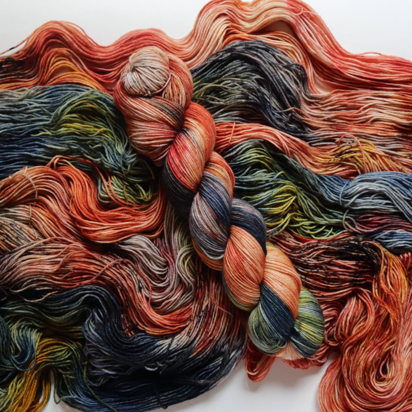 This colorway is inspired by a Japanese summer "matsuri" or "festival", with vibrant pops of red and orange that permeates the deep blues of a night sky - it's a warm summer night in a skein!