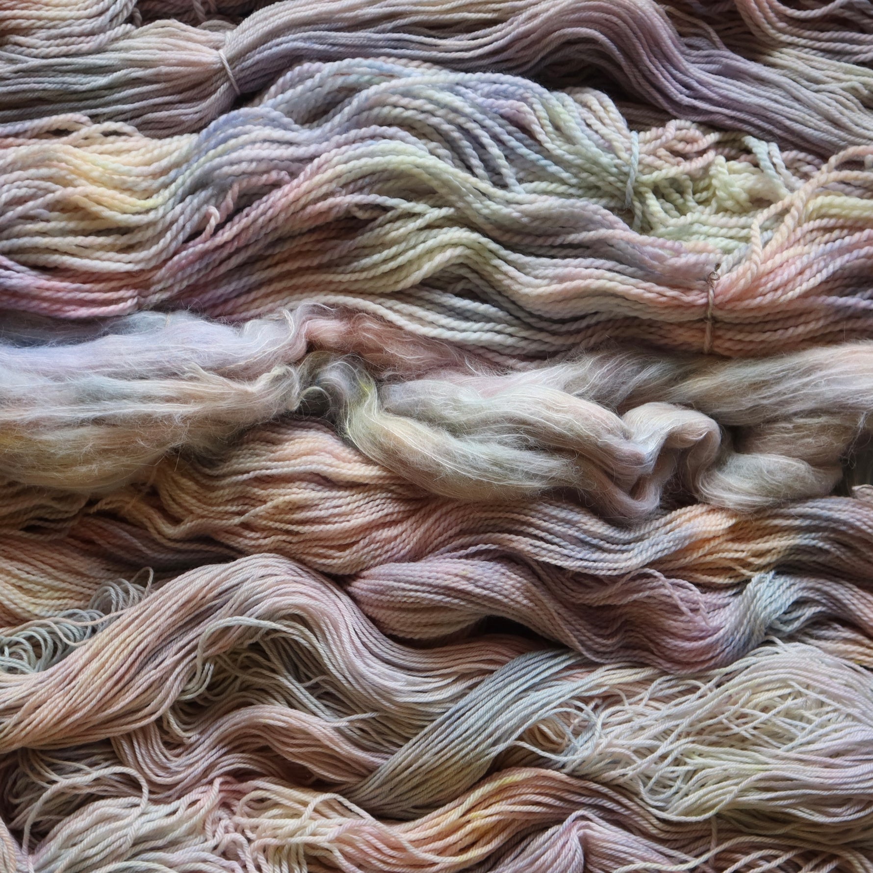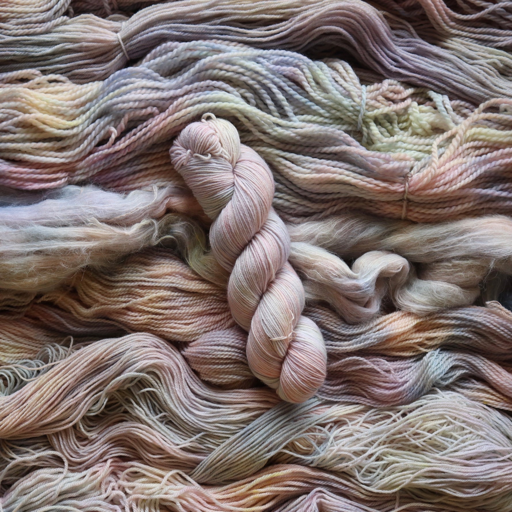 “Yume”, which means “dream” in Japanese, is a softly variegated colorway with dreamy layers of pink, blues, purples, and yellows. It almost feels like you’re floating on a cloud, and this colorway looks amazing in every base! It’s such a romantic colorway, perfect for spring!