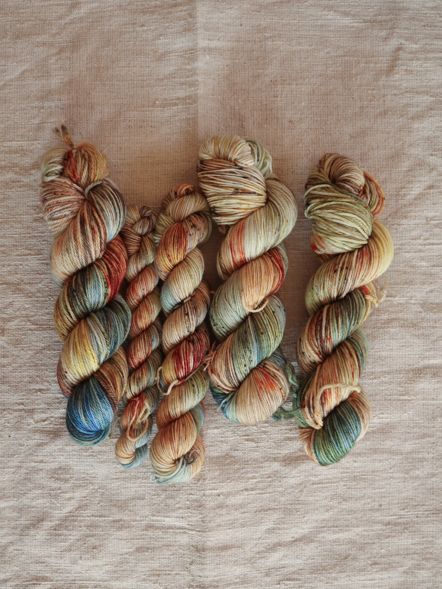 All skeins are carefully dyed with acid dye, washed and rinsed, however some bleeding may still occur. Each skein is unique and therefore colors may vary slightly from one to the next. Due to differences between monitors and screens, actual colors may also vary from what is shown. I recommend handwashing in cool water. Listing is for one skein only!