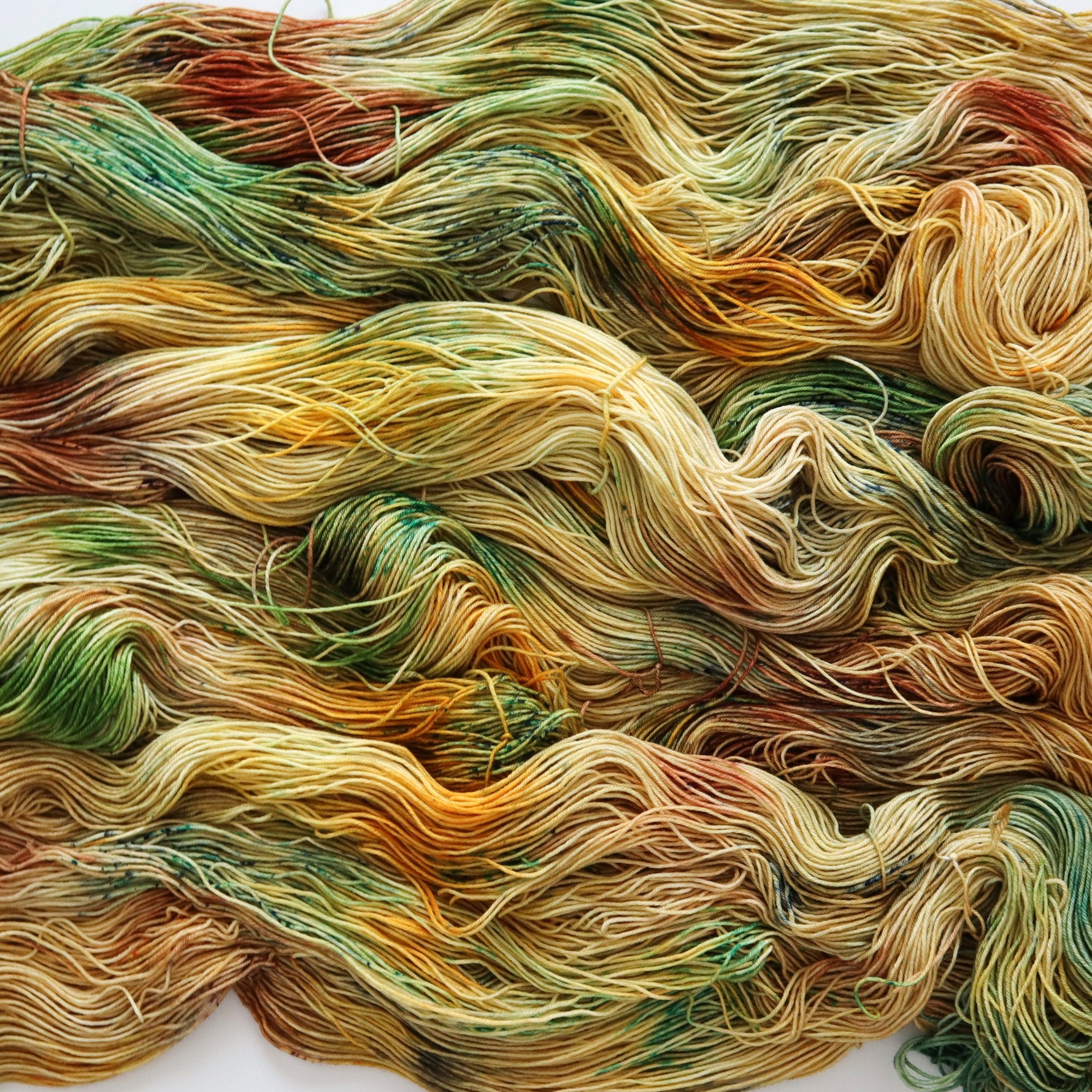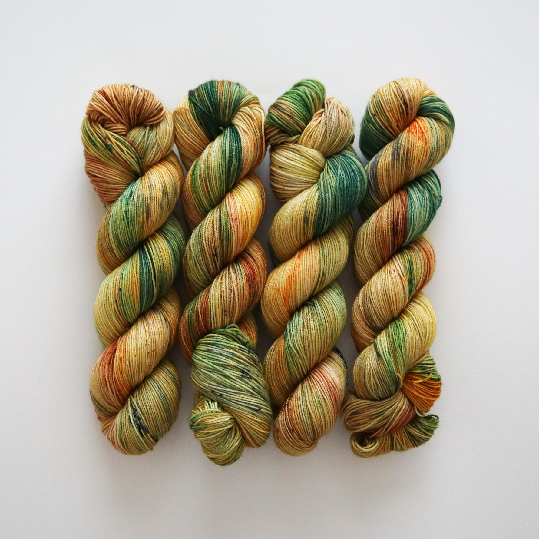 "Himawari" or "Sunflower" in Japanese, looks exactly like its namesake - bright yellow with pops and speckles of summery green. (Shown on Superwash Merino Nylon Sock)