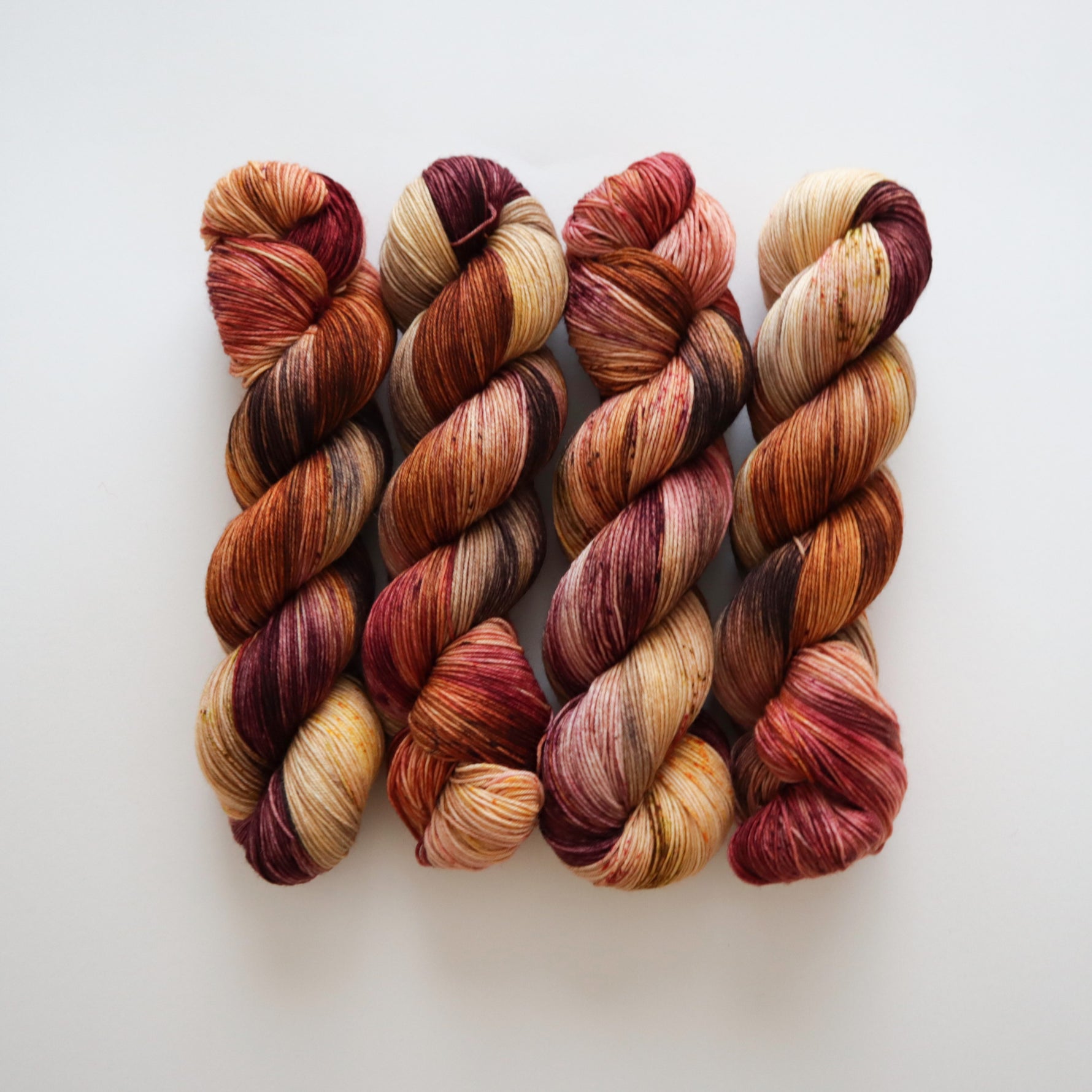 Inspired by my last alcoholic drink before I realized I was severely allergic to alcohol, Sangria is a beautiful and flavorful mix of wine red, burgundy, and fruity yellow and orange. It's almost as good as the real deal, and can be enjoyed by just about anyone! (Shown on Superwash Merino Nylon Sock)